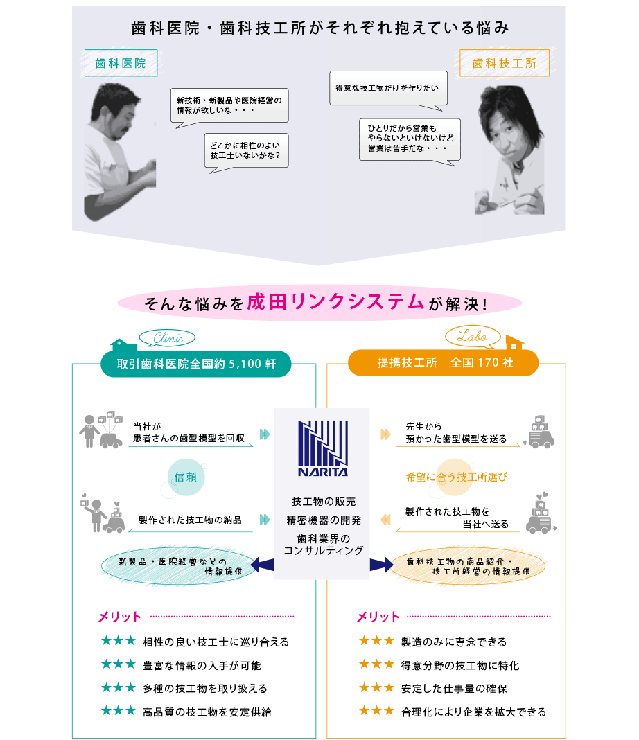 全国の優秀な技工所を提携しているため、歯科医院の先生一人ひとりと相性のよい技工士をマッチングし、 双方をコーディネートするシステム「成田リンクシステム」を全国に先駆けて構築しました。