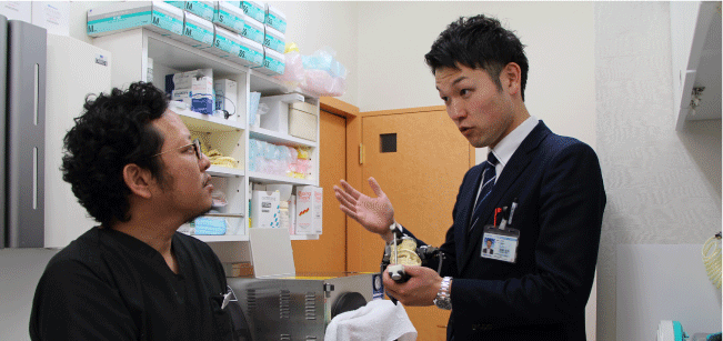 1日30軒前後の歯科医院へ車で訪問し、歯科技工物(入れ歯・銀歯・スポーツマウスガード・矯正器具等)の提案・販売・情報提供を行う。 歯科医師と技工士の間に立ち、双方をコーディネートすることで患者様に喜んでもらう技工物を提供する。 歯で「笑顔」を増やし、笑顔で「社会貢献」ができる仕事。
