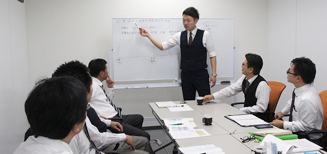 営業所目標や連絡事項を確認。経営理念・方針を全員で唱和したりと、営業所の意識をひとつにする時間になります。